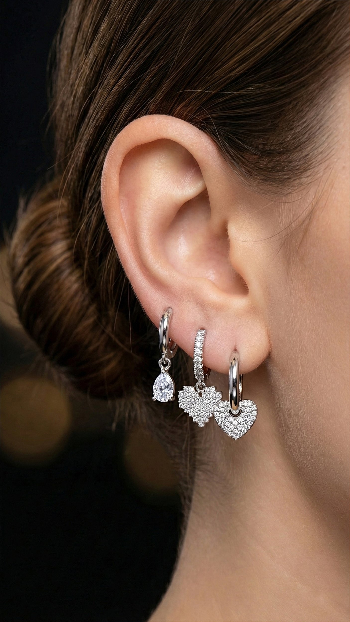 Brinco Trio Corações Gota Cravejado Zircônia Prata