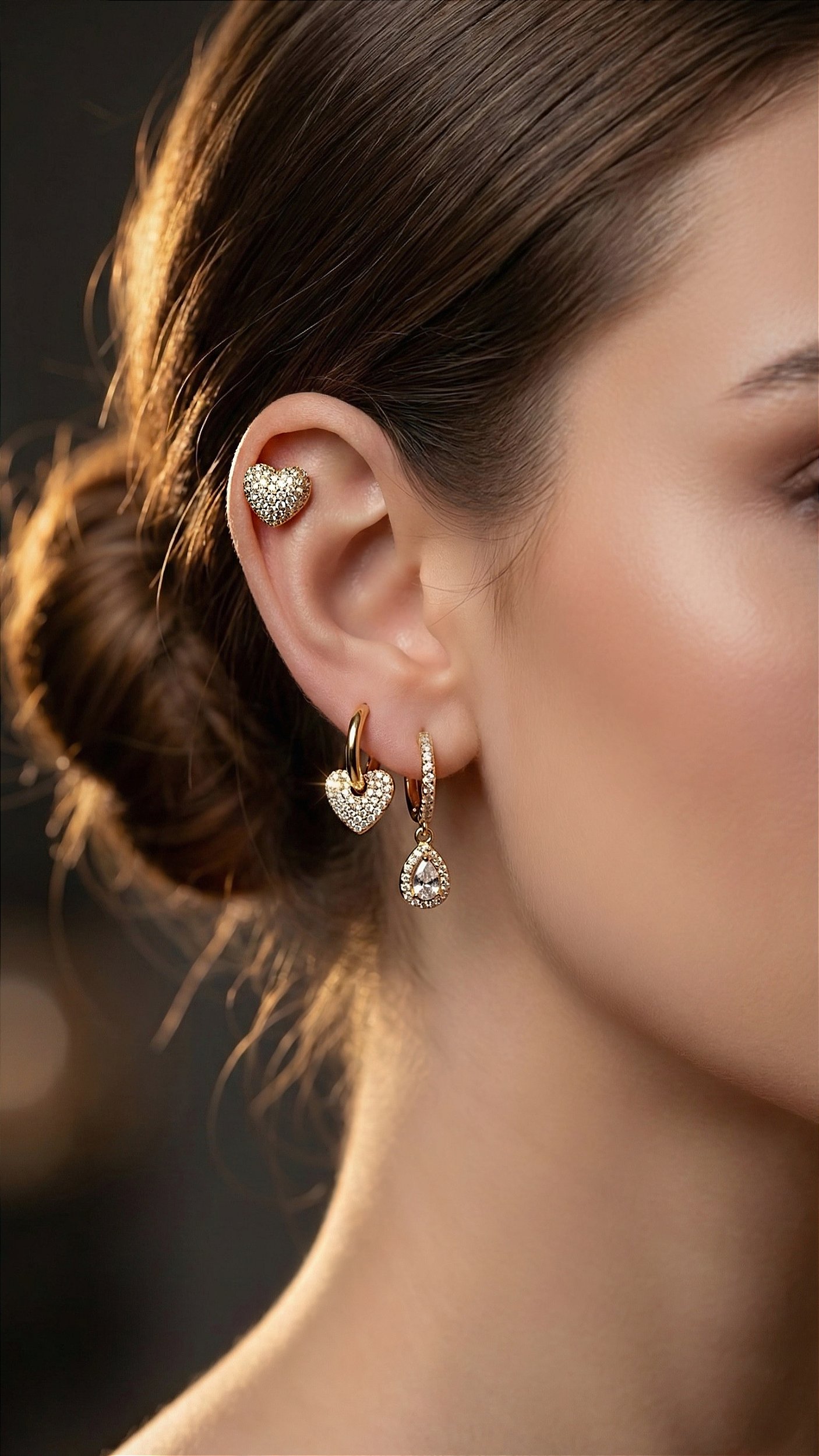 Brincos Trio Insp Pandora Corações Cravejados Dourado