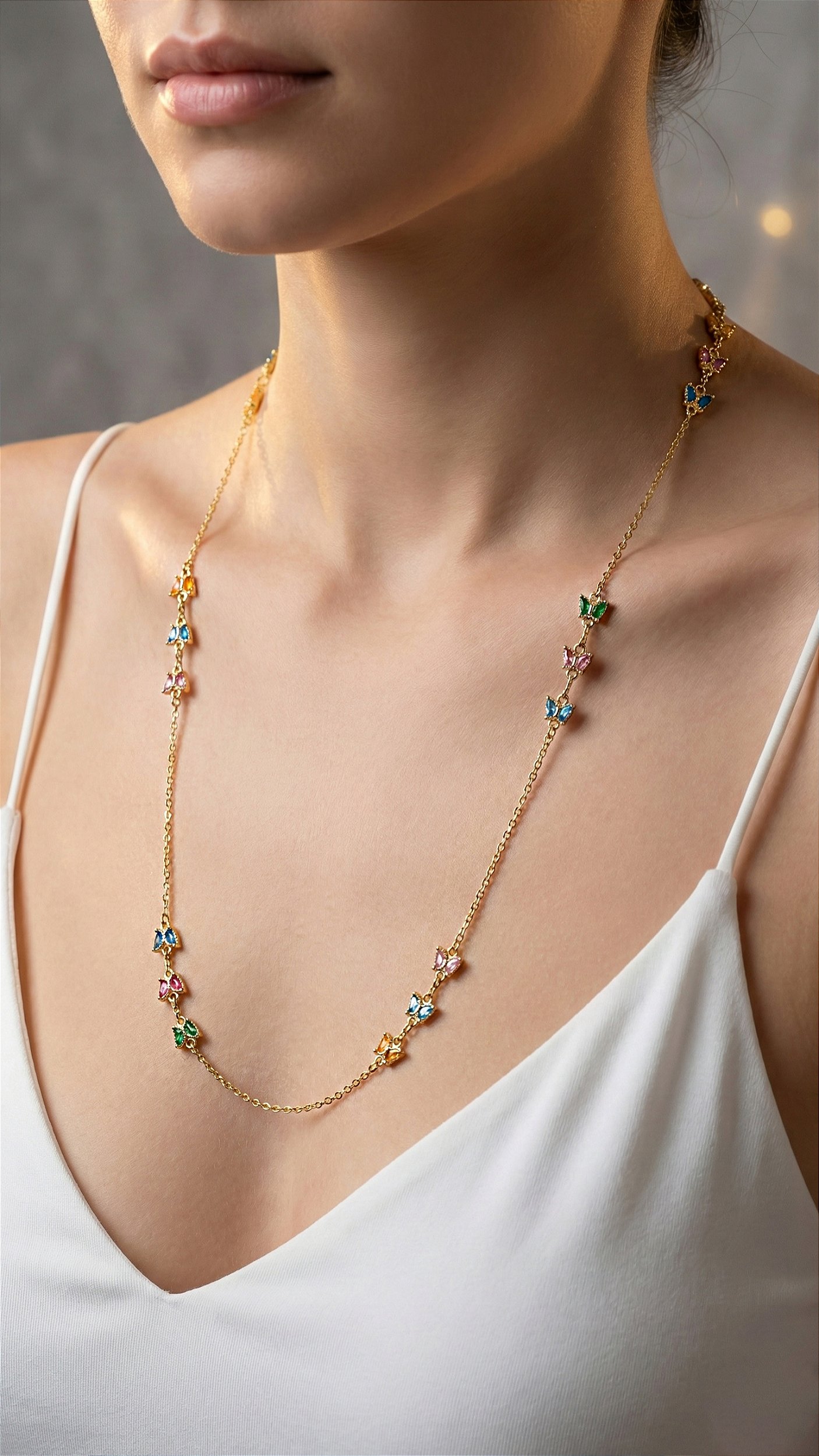 Colar Alongado Borboletas Zircônias Coloridas Dourado