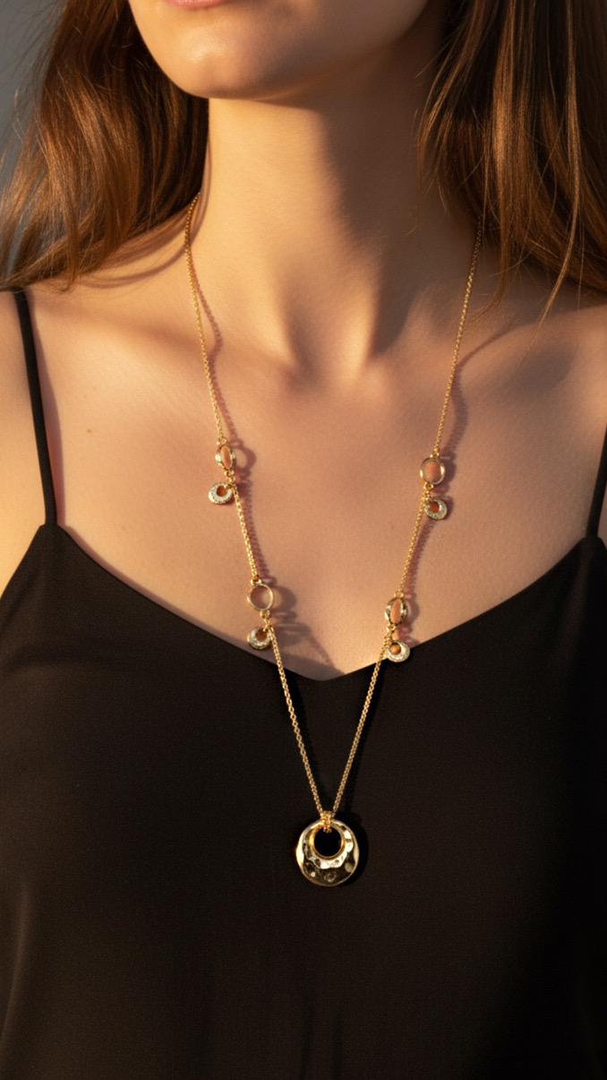 Colares alongados são tendência nas passarelas como Chloé. Combine com o nosso brinco alongado orgânico (vendido separadamente).