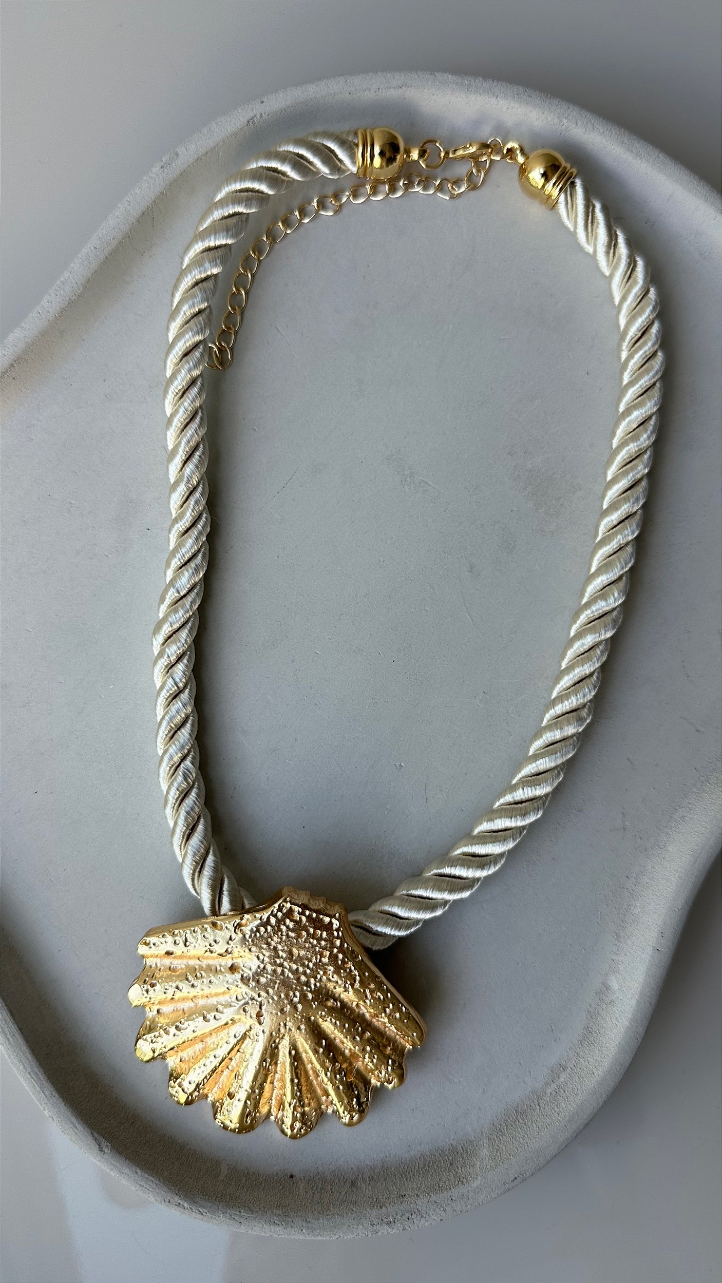 Material e Qualidade: Nossas peças são banhadas a Ouro 18k ou Ródio Branco e finalizadas com um verniz especial que protege e aumenta a durabilidade! Além disso o colar possuí cordão em linha com pingente de concha, trazendo a tendência de elementos do mar para o acessórios. É possível ajustar altura.