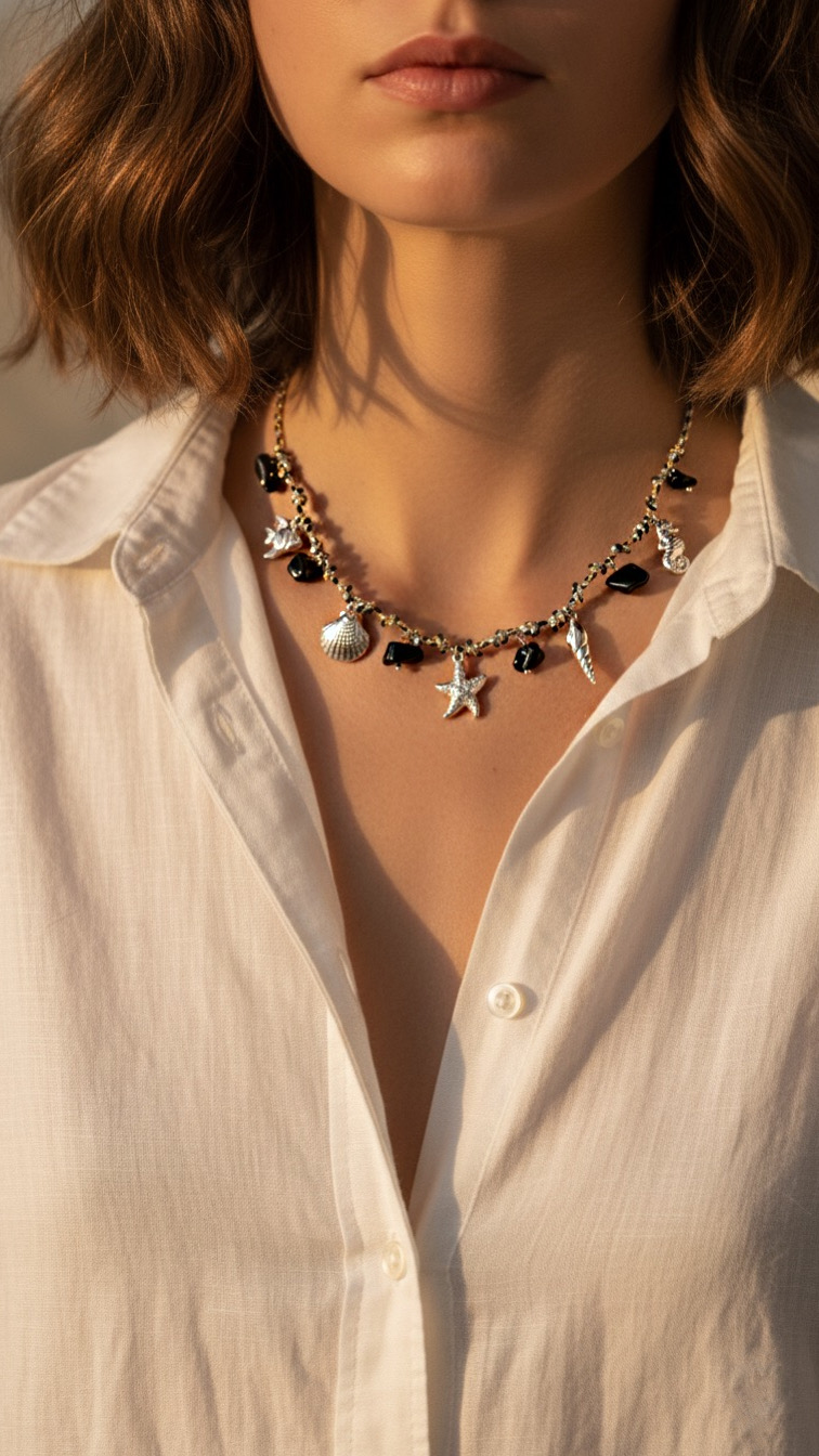 Acessórios com elementos do mar, são itens garantido nos looks de primavera/verão! Além disso o colar possuí pedras em resina preta, trazendo modernidade para a peça.