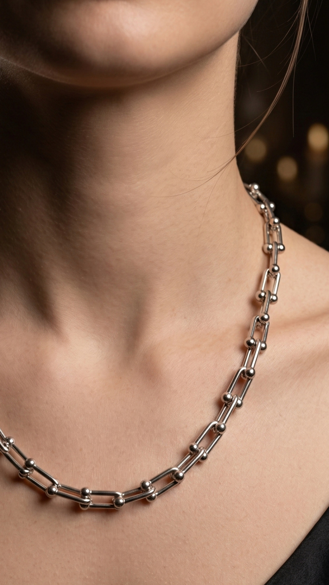 Material e Qualidade: Nossas peças são confeccionadas em aço inoxidável de alta qualidade, conhecido por sua excepcional resistência à corrosão e durabilidade. Este material não escurece e mantém seu brilho por muito mais tempo, mesmo em contato com água e suor. Design inspirado em grandes marcas de Luxo, trazem a sofisticação icônica e a elegância atemporal para os acessórios. Ajustável na altura do pescoço.