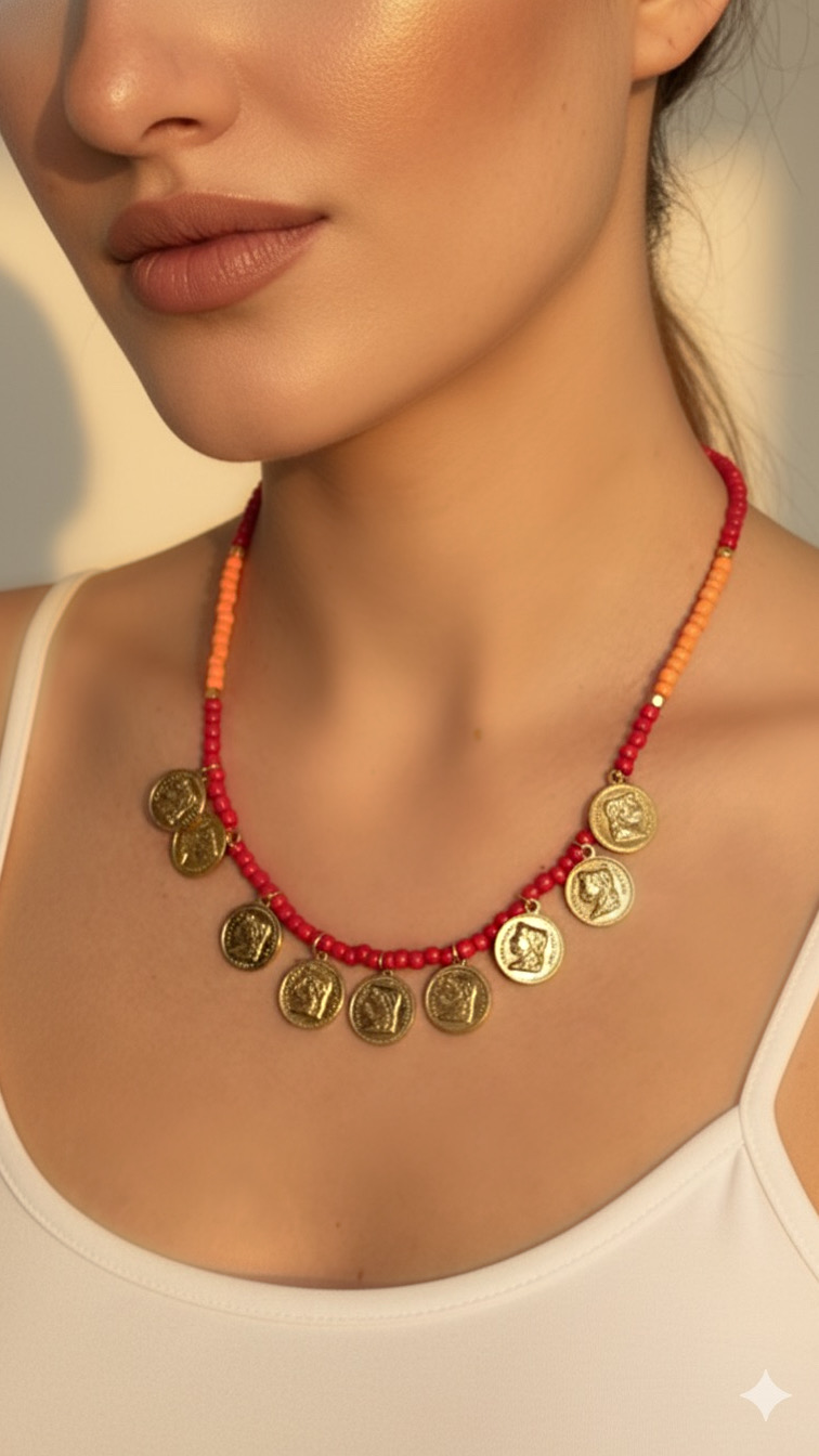 O colar possuí detalhes em miçangas vermelhas e laranjas, trazendo um diferencial para a peça. Ajustável no tamanho.