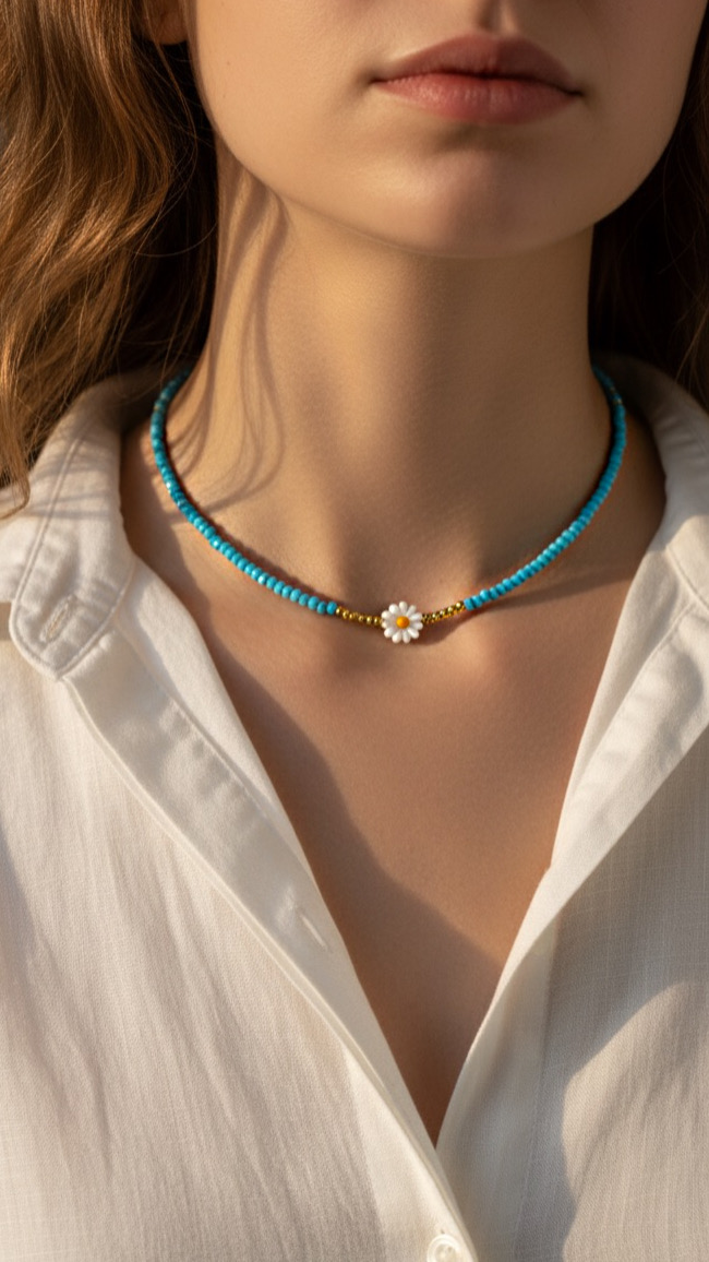Além disso, a peça possuí miçangas cristais azuis, que deixam o acessório delicado e moderno.