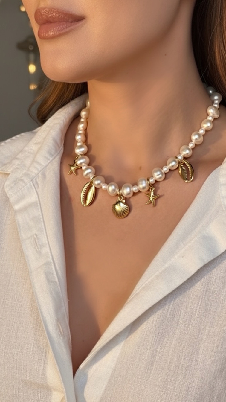 Além disso, a peça contém pérolas artificiais e pingentes com elementos do mar, proporcionando um toque de modernidade e delicadeza