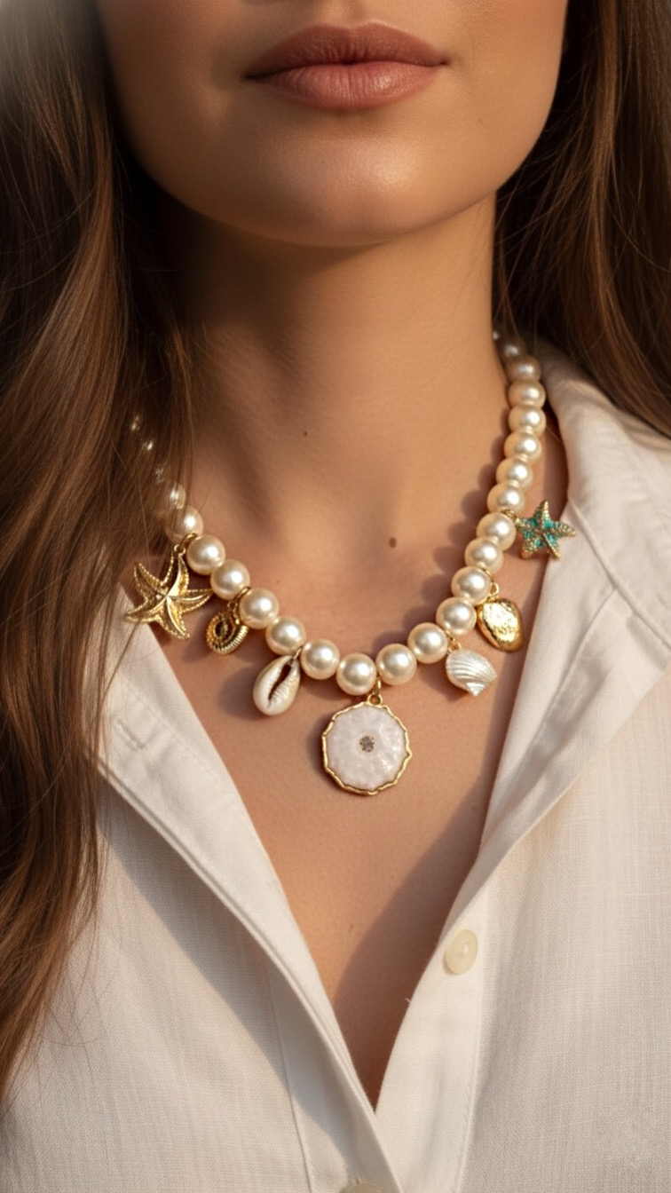 Além disso, a peça contém pérolas artificiais e elementos do mar, proporcionando um toque de elegância e sofisticação que vai te encantar.