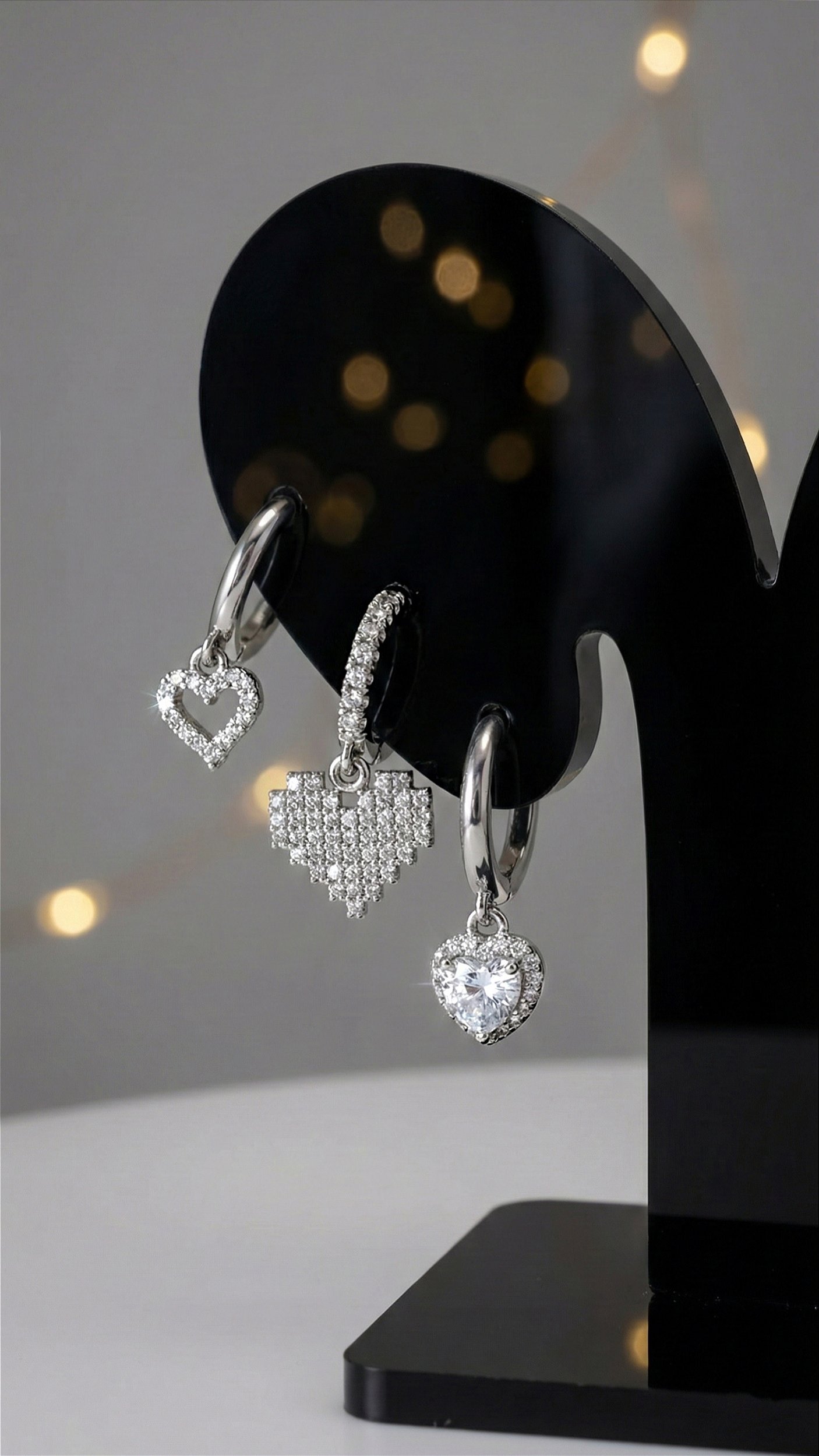 Brinco Trio Argolinhas Corações Cravejados Prata